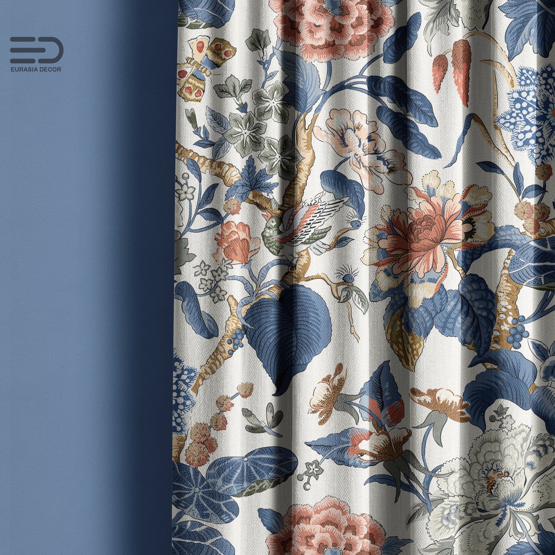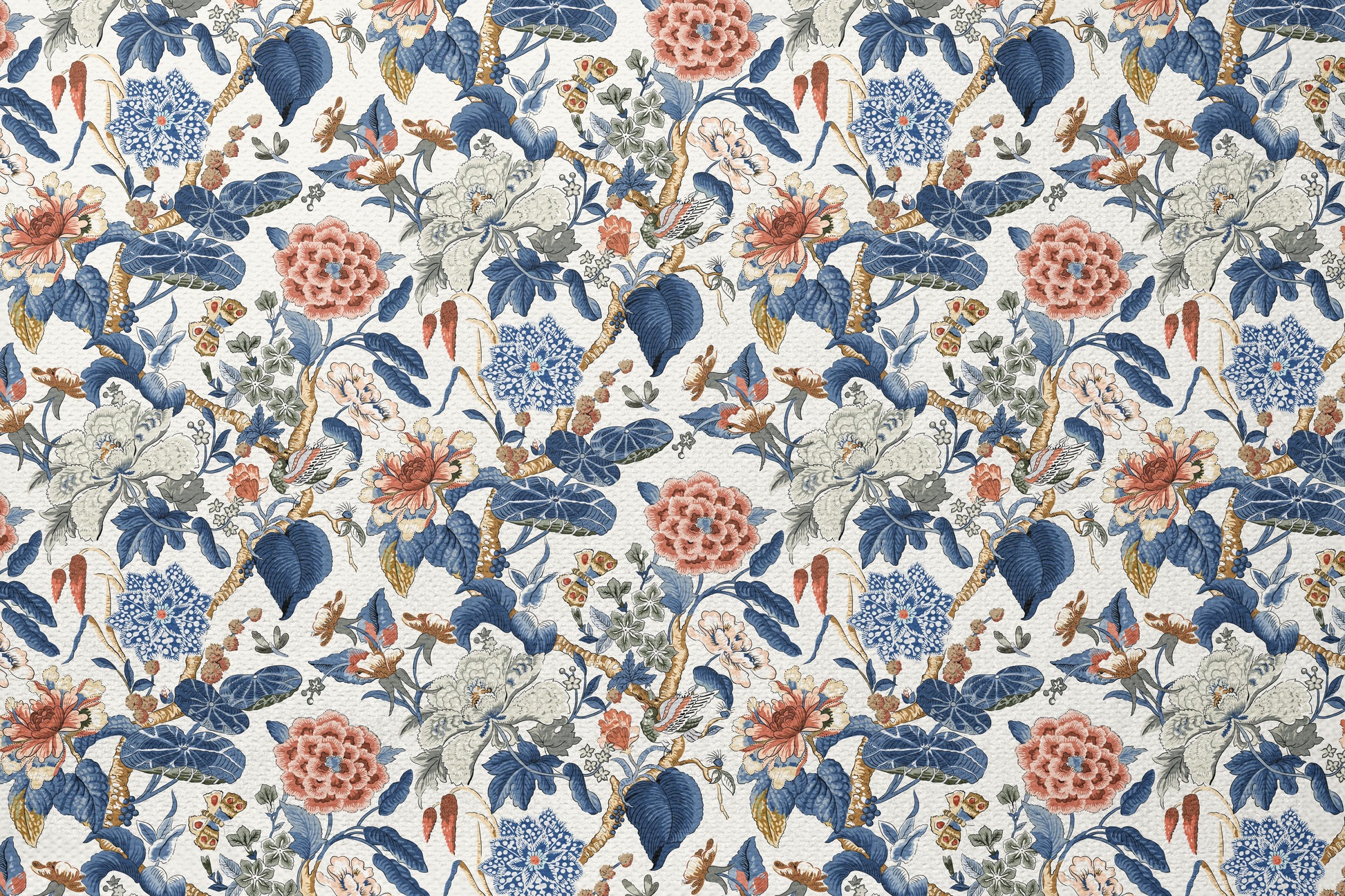 Infuse your space with timeless beauty using this Blossom Reverie fabric. The design showcases a vibrant tapestry of hand-painted flowers in shades of blue, coral, and cream, interwoven with lush green foliage on a crisp white background.