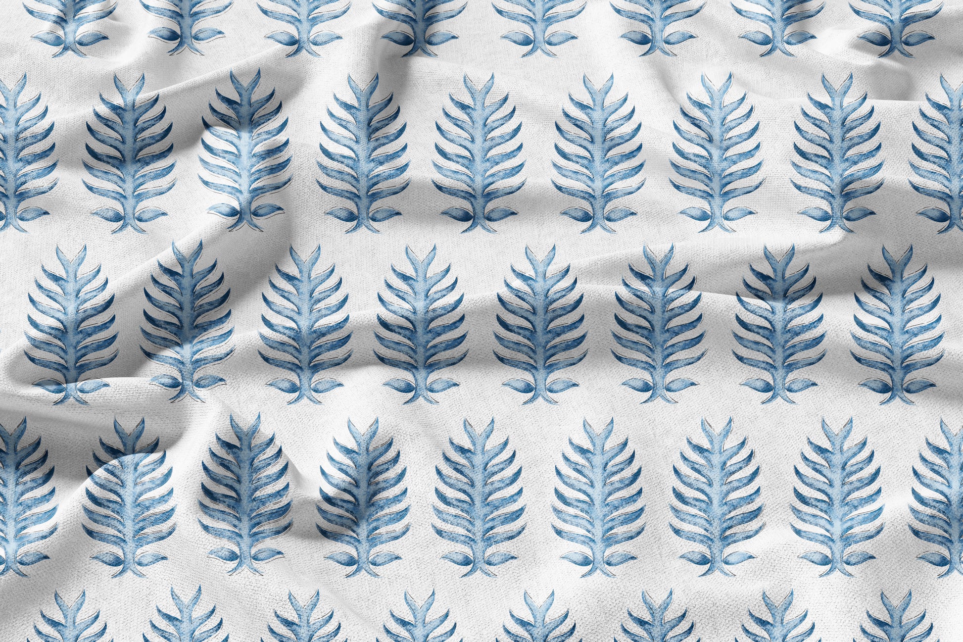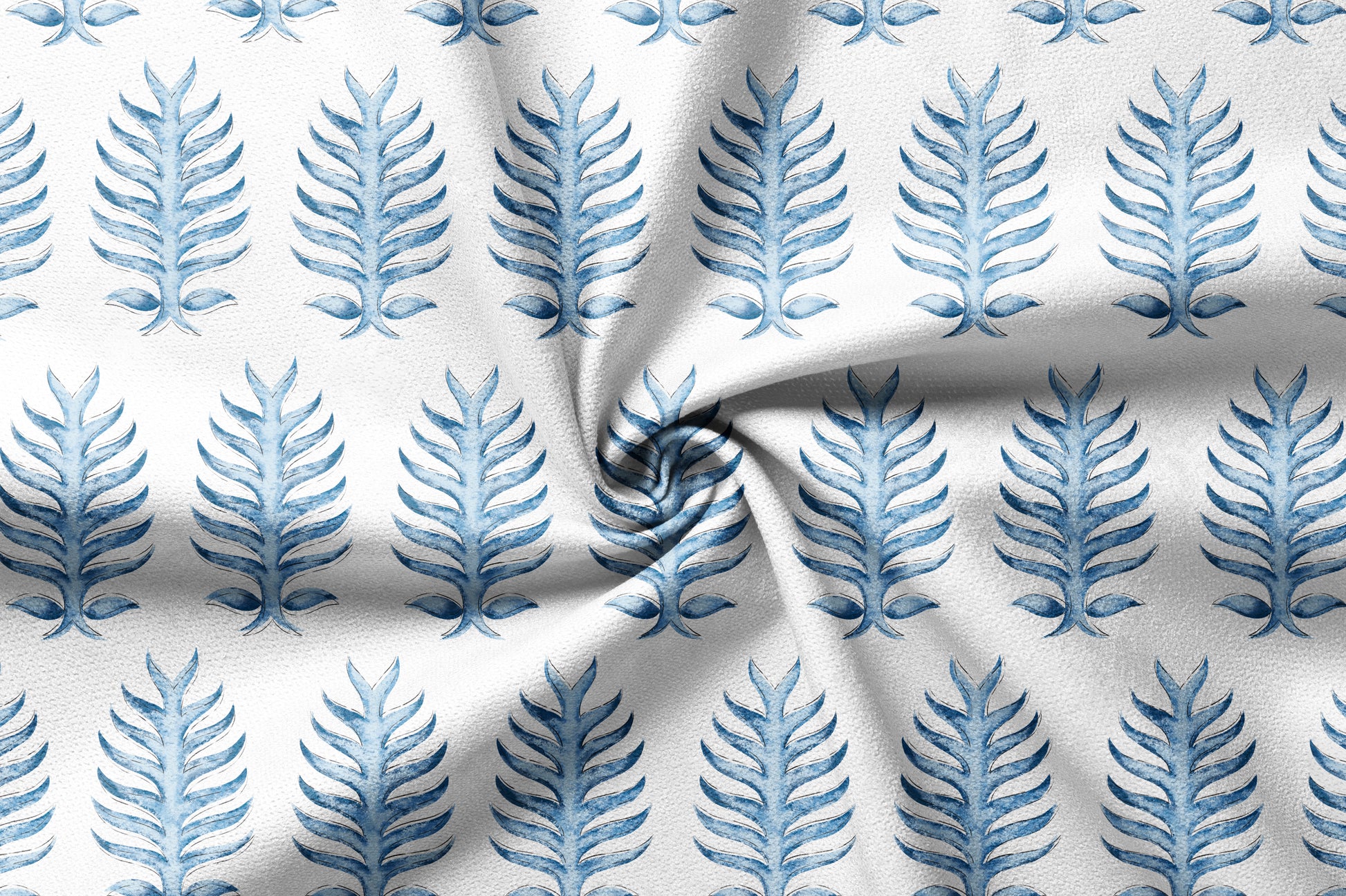 Refresh your home with the natural elegance of Calm Canopy fabric. This design showcases a repeating pattern of stylized blue fern leaves, carefully arranged in symmetrical rows on a clean white backdrop.