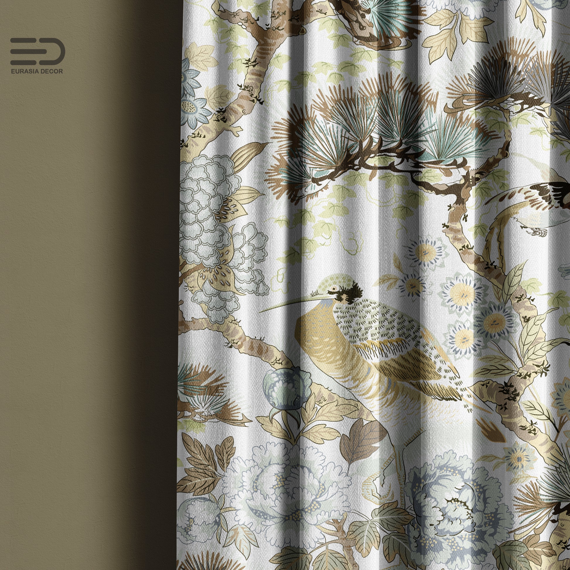 Bring timeless serenity to your home with this Montane printed fabric. The design features intricately illustrated birds nestled among blooming branches, delicate leaves, and subtle florals, all rendered in soft shades of taupe, sage, and muted blue on a creamy white background.