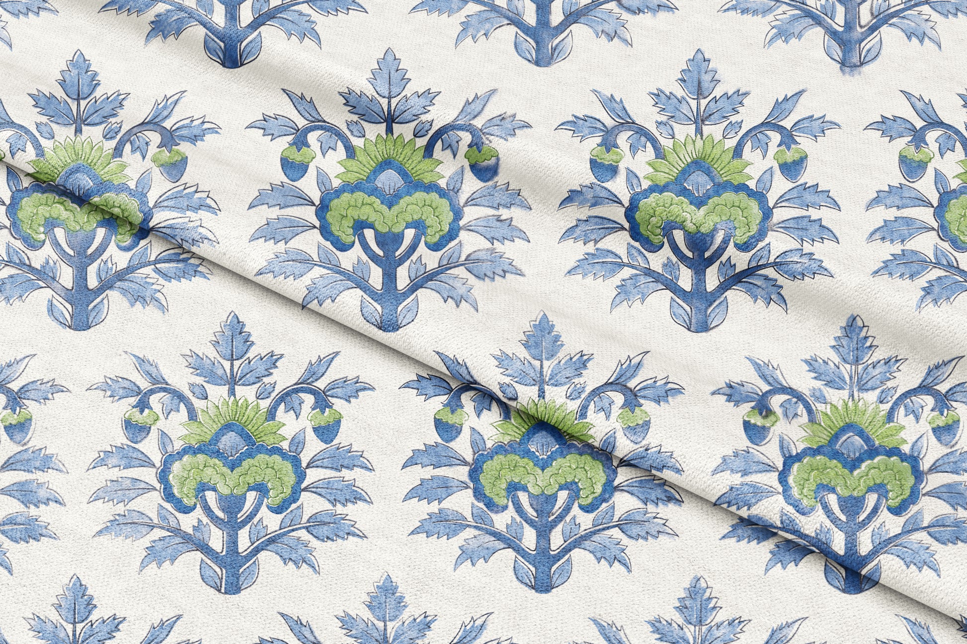 Elevate your space with the refined charm of our Floral Medley Motif fabric. This design features a repeating pattern of stylized medallion motifs in soft blue and green hues, inspired by classic and heritage textiles.