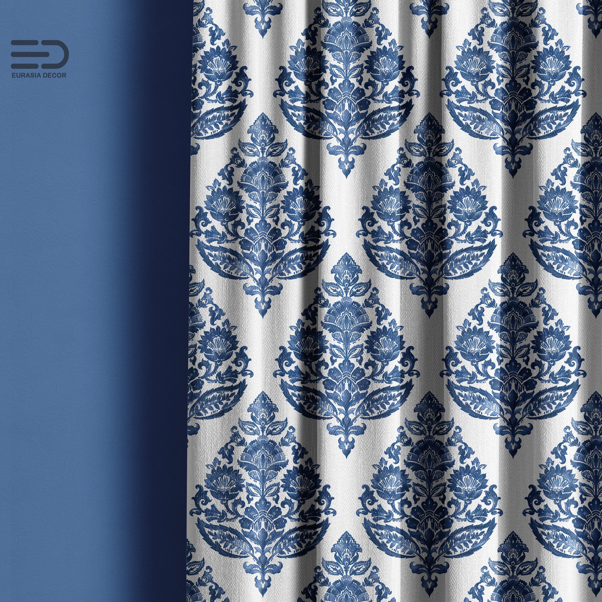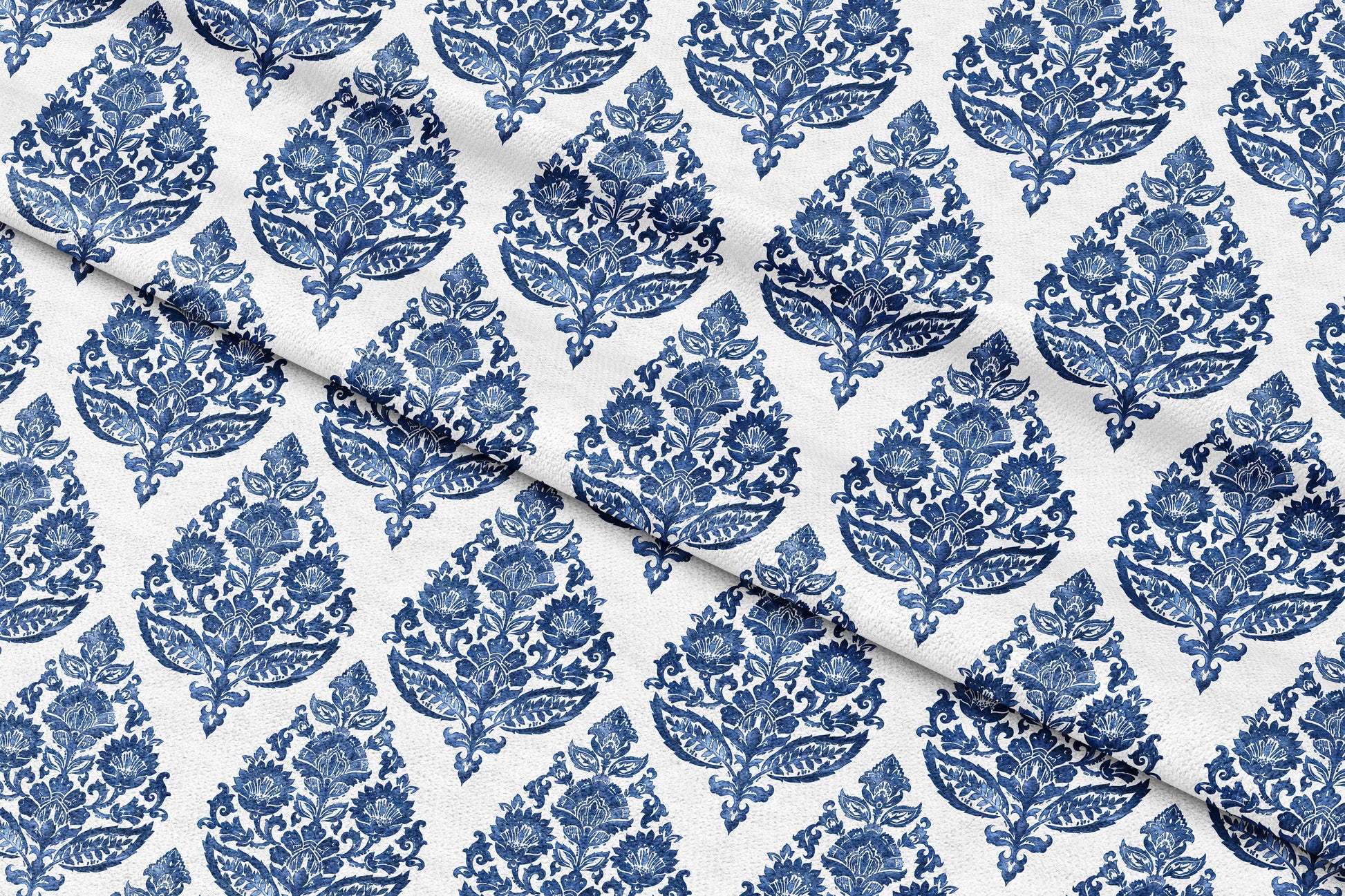 Elevate your interiors with our Mughal Trellis Motifs fabric. Featuring a repeating, hand-block-inspired pattern of stylized blue florals arranged in a classic Mughal trellis, this design brings timeless elegance and heritage artistry to any space.