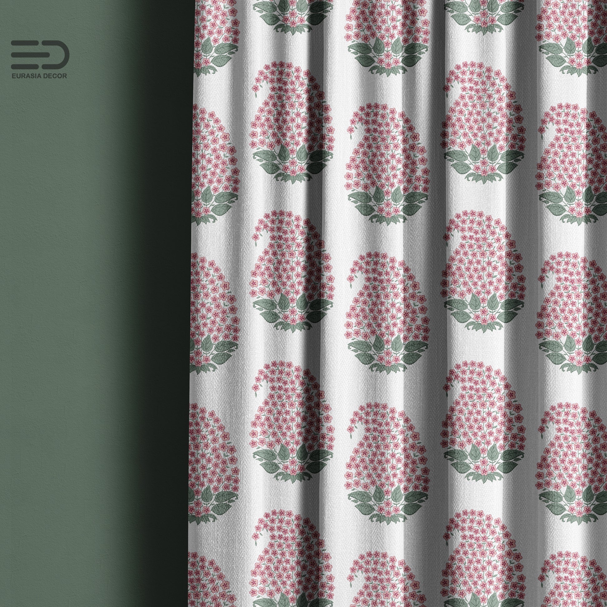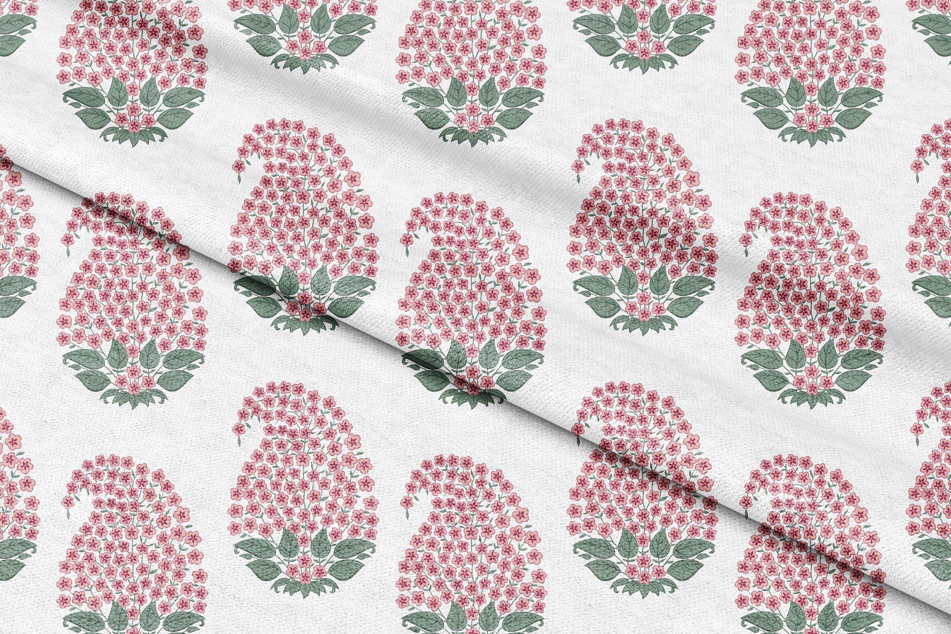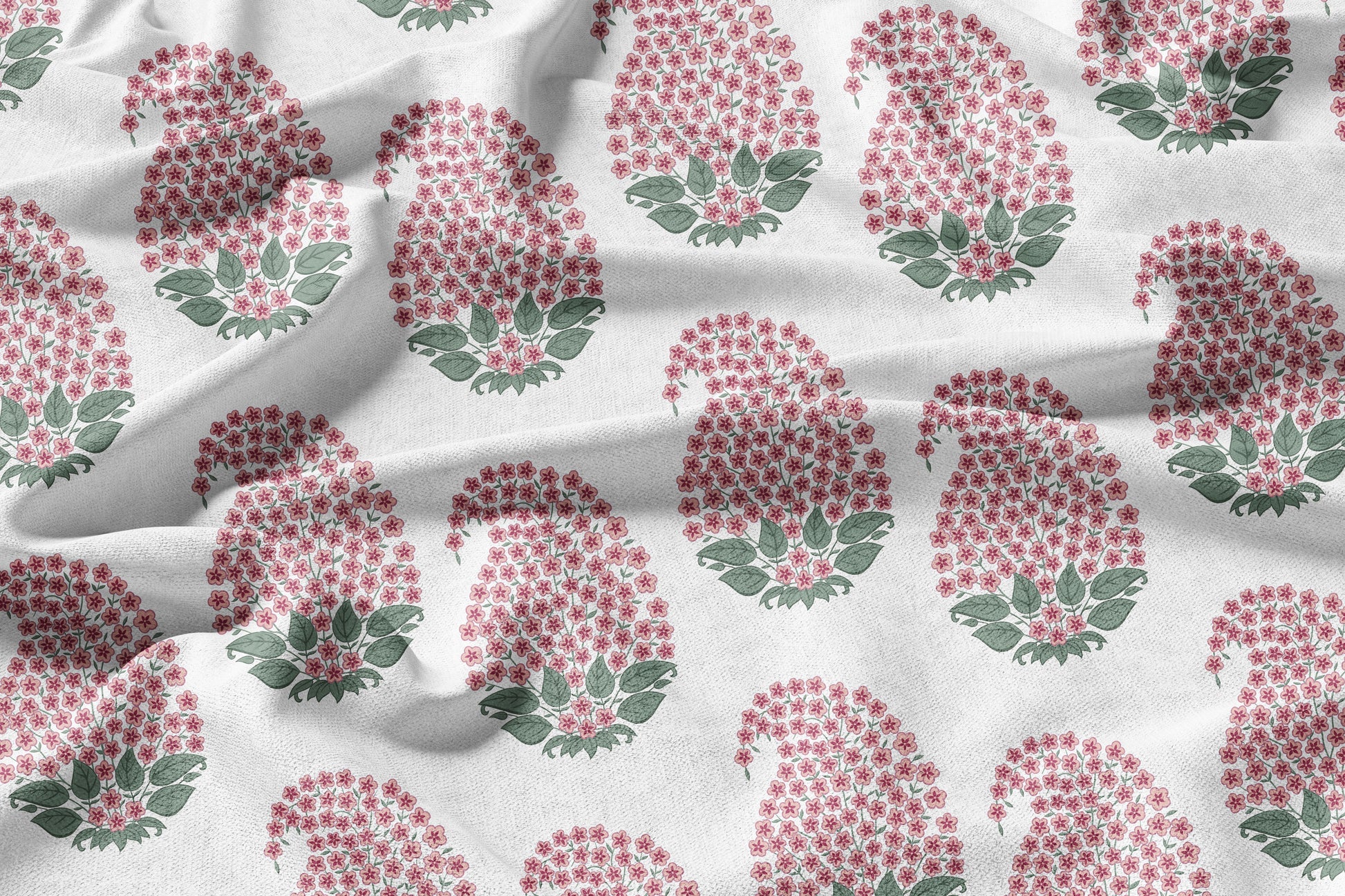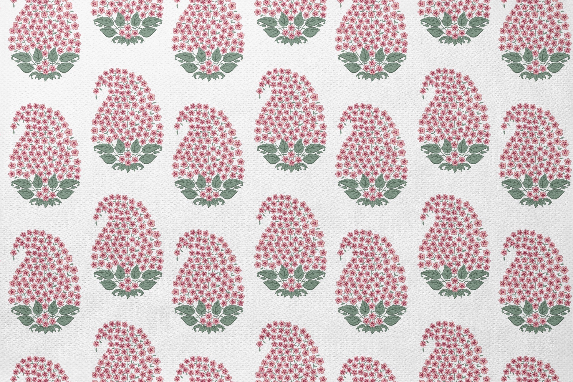 Infuse your home with gentle elegance using this Paiselle fabric. The design features a repeating pattern of classic paisley shapes, each formed by clusters of soft pink floral elements and accented with subtle green leaves, all set against a crisp white background.